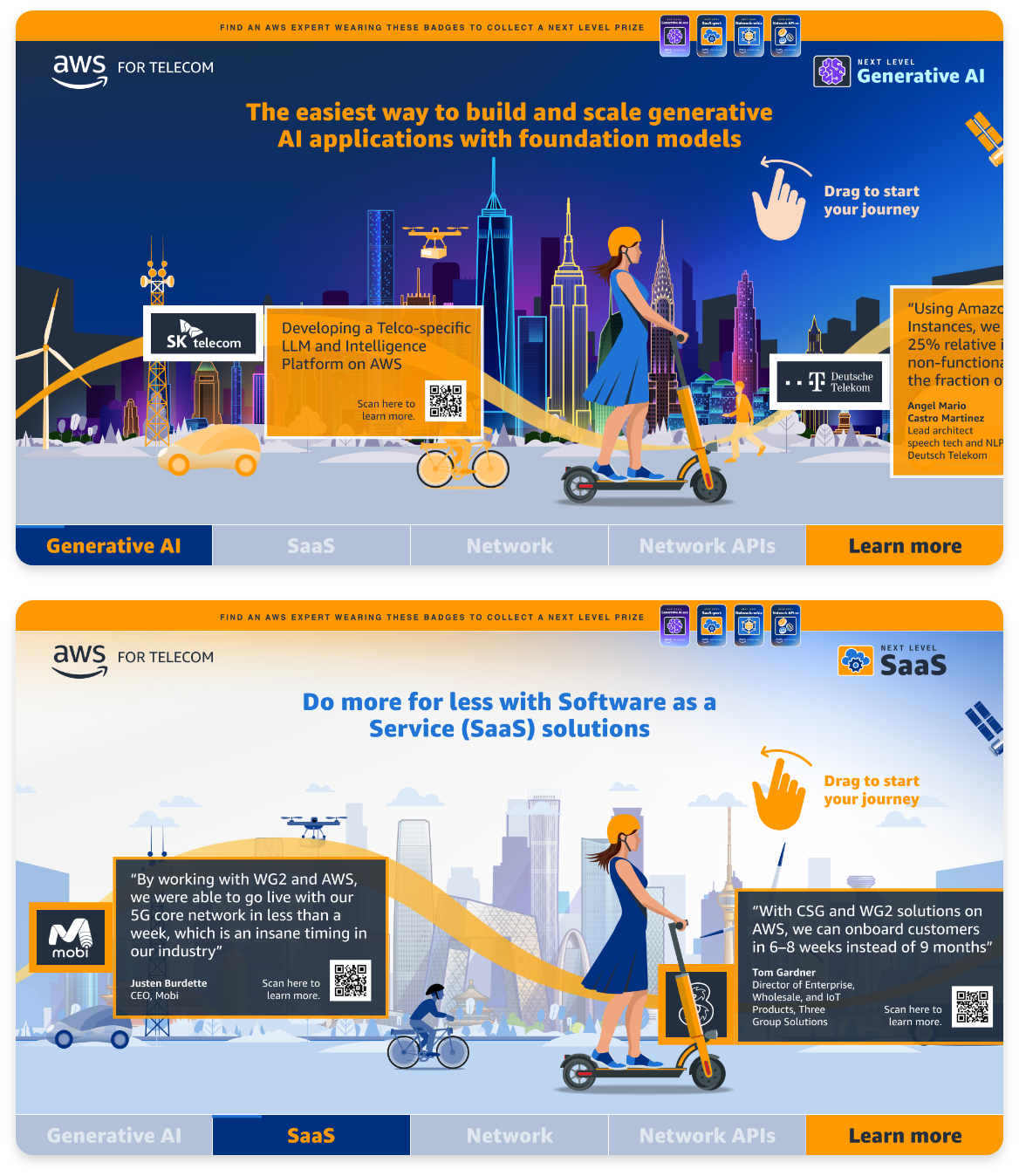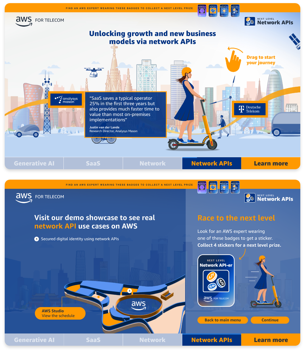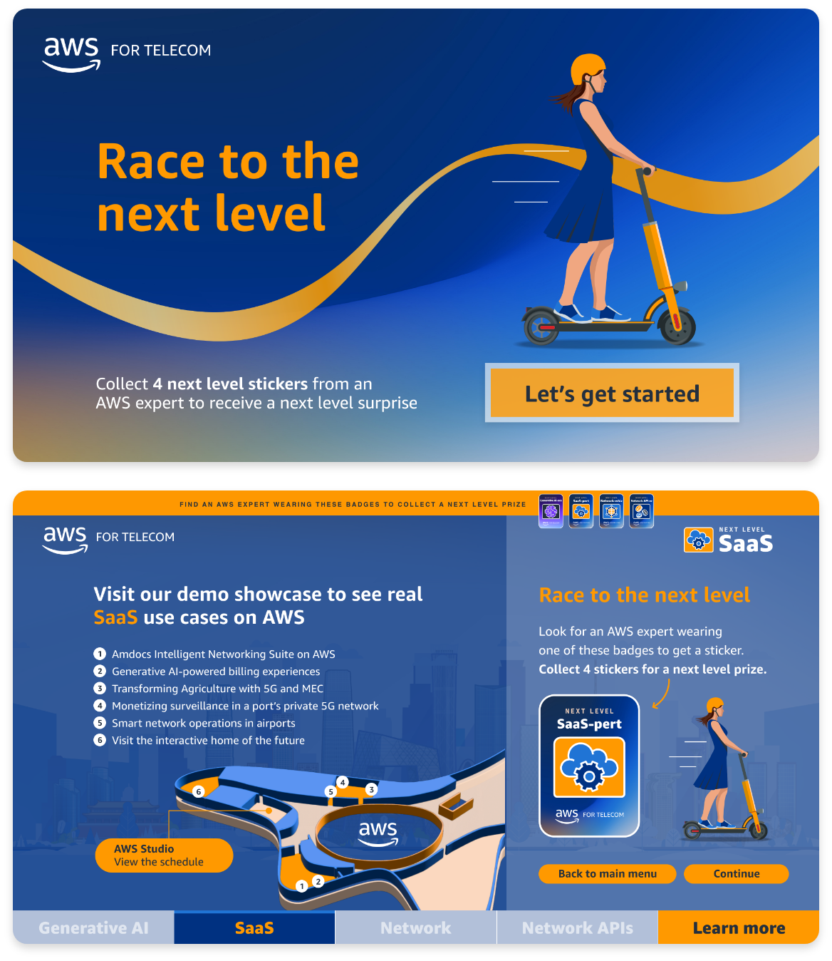 ‘Race to the Next Level’ was an interactive touch screen application created by JPC for their client, AWS, designed for the MWC Barcelona 2024 trade show. JPC’s team envisioned and designed the application that offers an engaging way for attendees to explore AWS services through swiping, while also measuring user interest in AWS products. Based on the original idea, vision, and design by JPC, we helped in developing the app and bringing this project to life, ensuring all functional requirements were met.