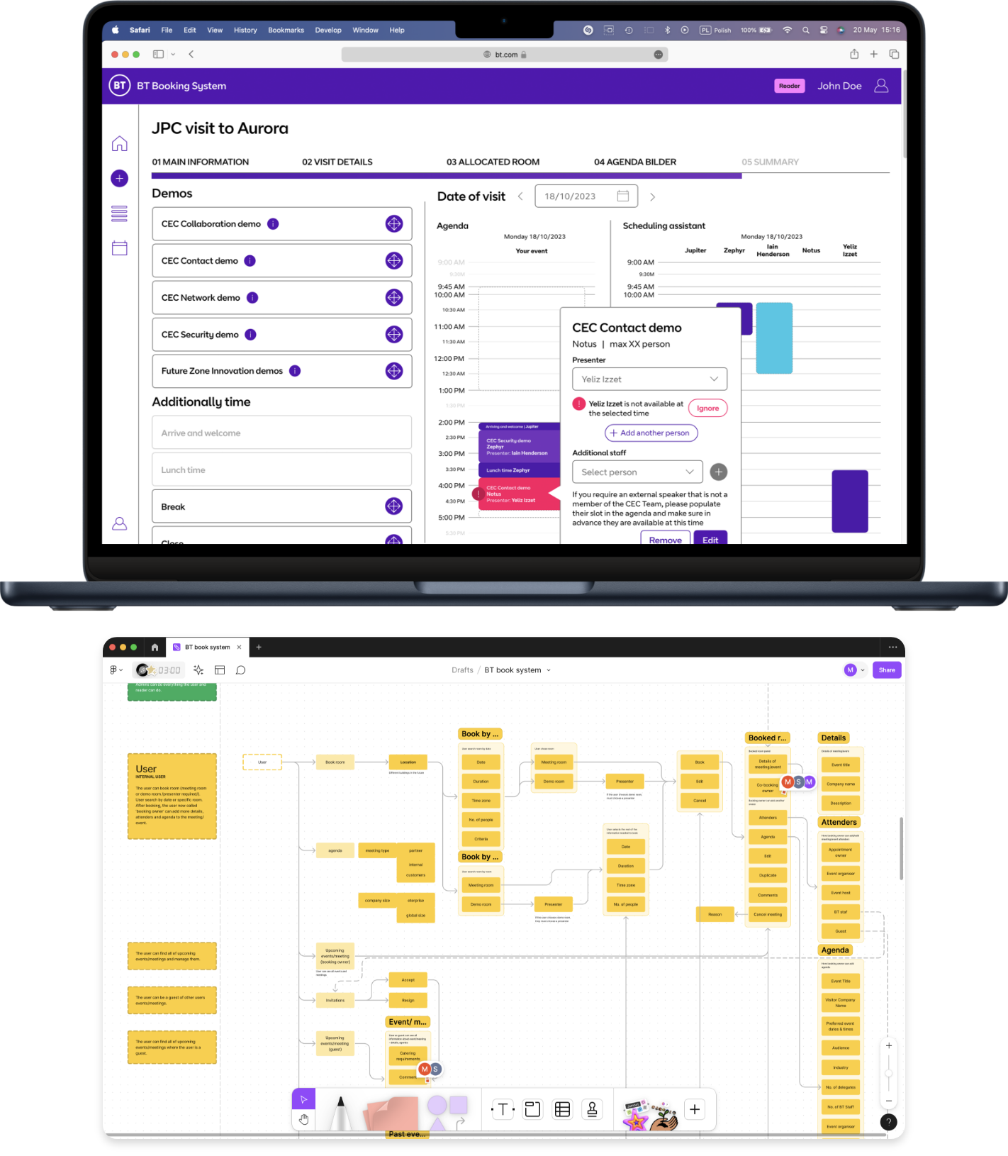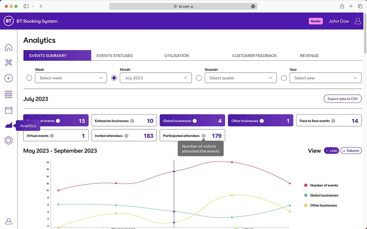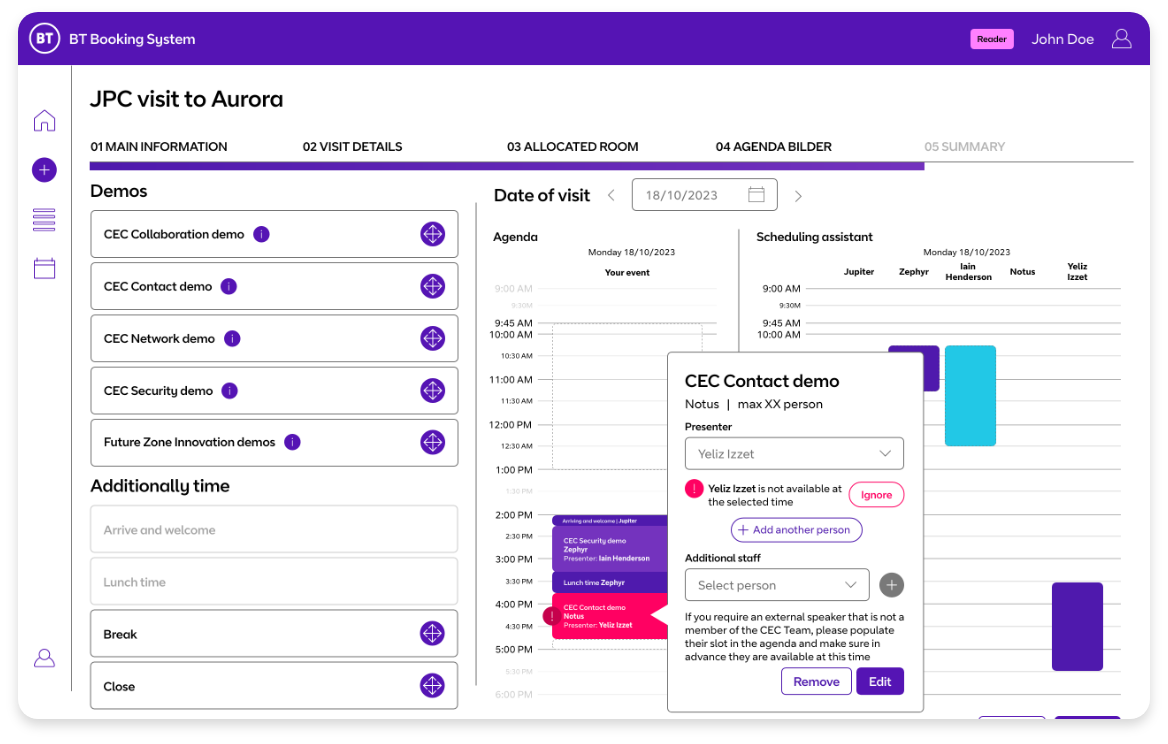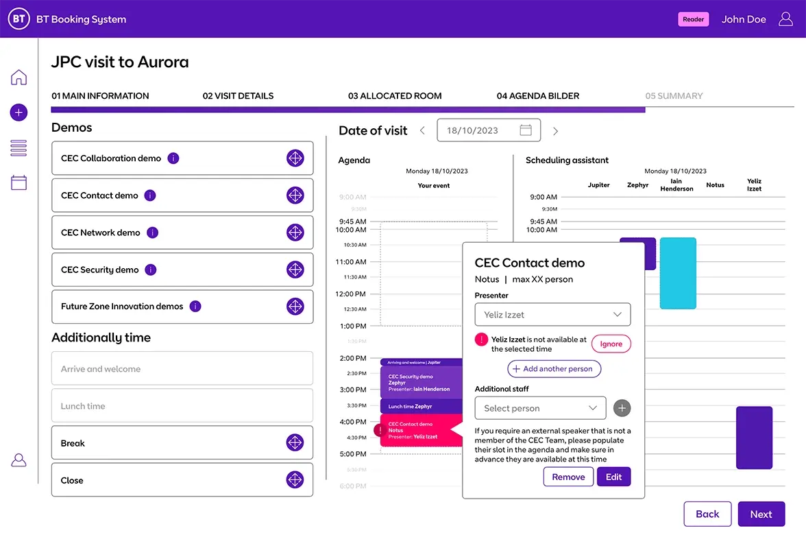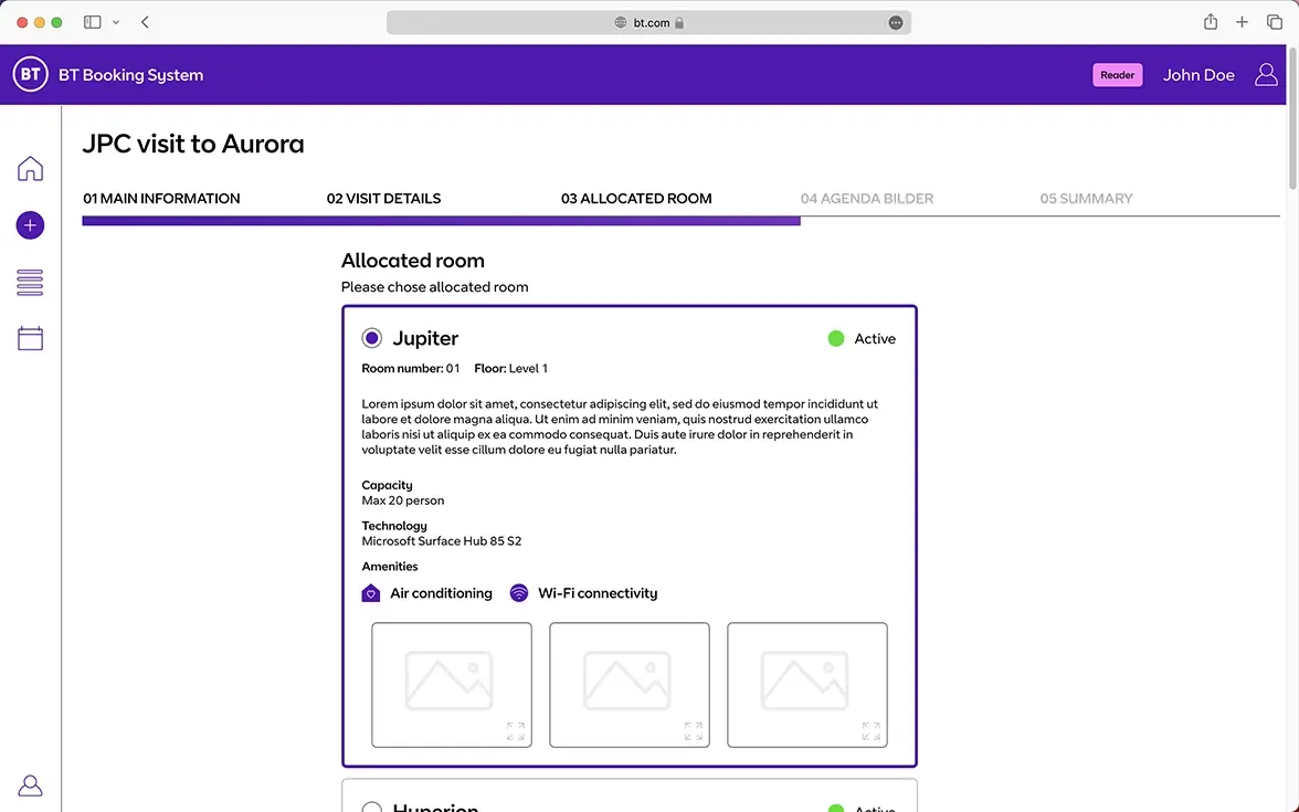 BT Appointment Tool is an advanced web application being developed by JPC for BT Group, one of their largest clients, to automate the organisation of visits and meetings for clients and partners at BT’s premises. The primary goal is to streamline the meeting planning process through a simple request sent to the application. The system will check participant and meeting room availability, automatically book necessary spaces, schedule presentations, and allocate time for key personnel. Additionally, it will organise preparatory meetings for the planners, send invitations to attendees, and even provide reminders for catering orders if needed. The application will also feature detailed analysis tools for meetings and presentations based on participant feedback. Fully integrated with the Microsoft Outlook calendars of BT employees, it will ensure data security through Microsoft Power Pages. Building on JPC’s team vision, concept, and design, we are contributing to the UX design and development of the app, creating a product that perfectly aligns with BT’s defined functional needs.