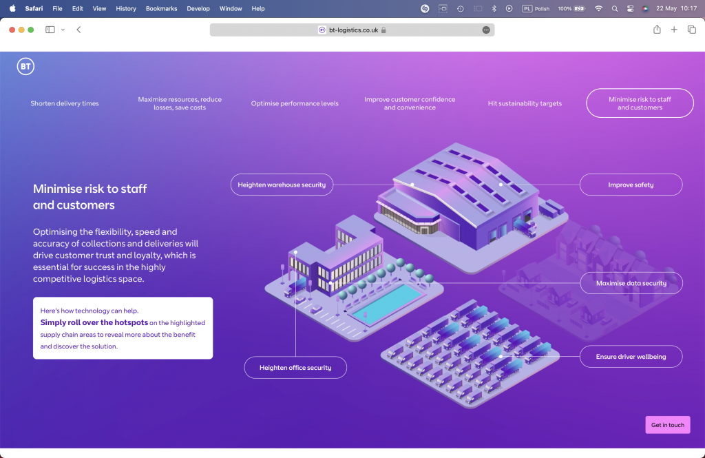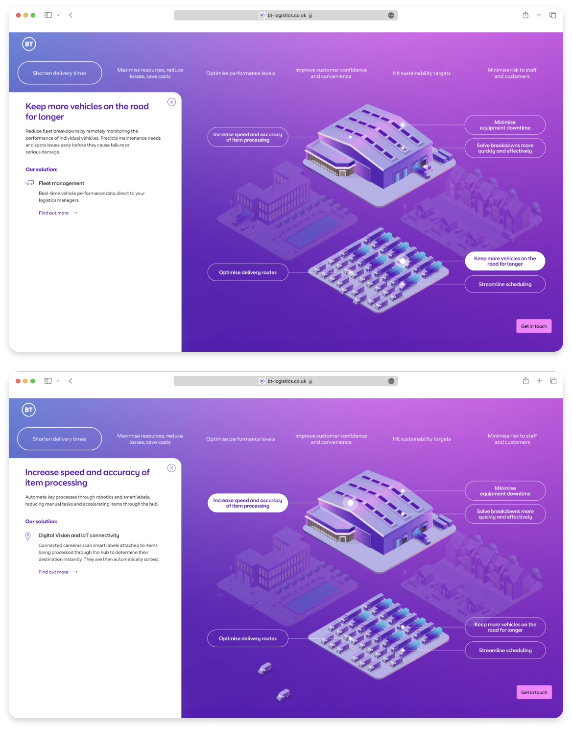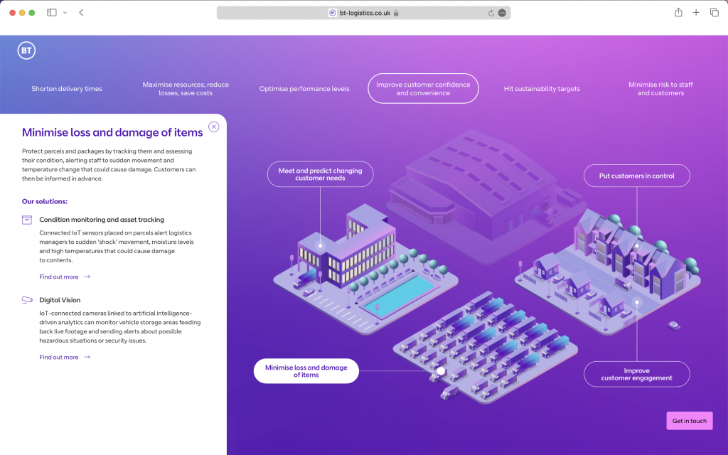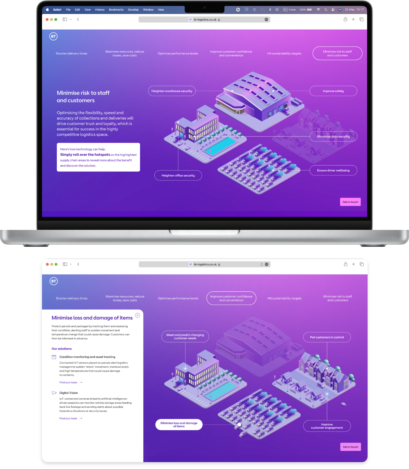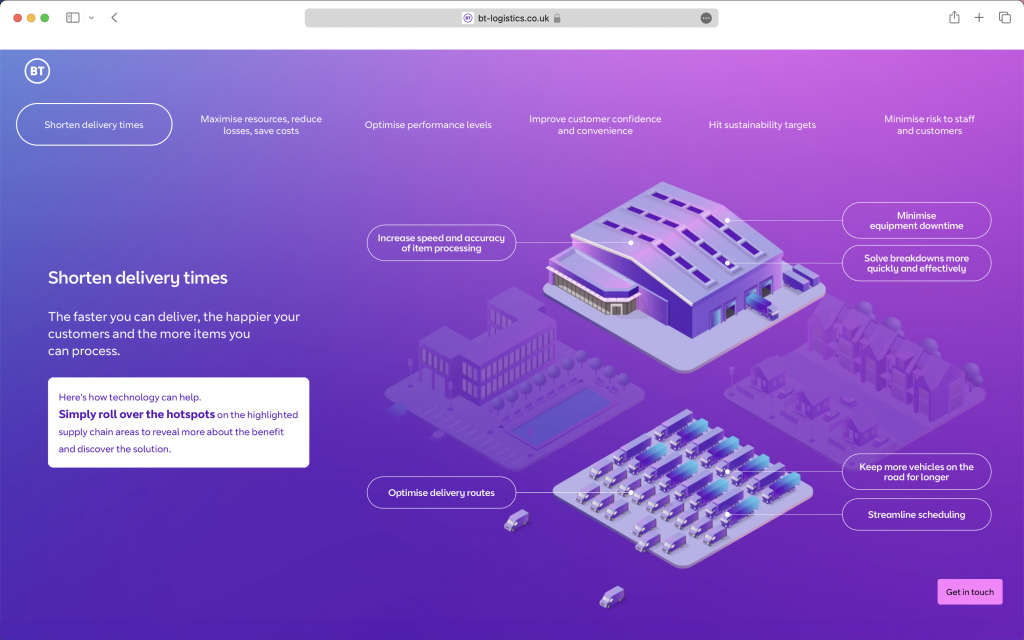 Built on JPC’s original concept, we helped their team develop, the ‘BT Logistics Platform’. The platform serves as a captivating storytelling tool dedicated to showcasing BT’s cutting-edge logistics solutions through compelling real-world use cases. Seamlessly merging technology and narrative, the app guides users on an immersive journey, highlighting the profound impact of BT’s offerings. By offering an experiential exploration of their solutions, the app effectively communicates BT’s expertise and commitment to revolutionising logistics. This interactive experience exemplifies BT’s dedication to innovation and its ability to seamlessly bridge technological advancements with practical applications.