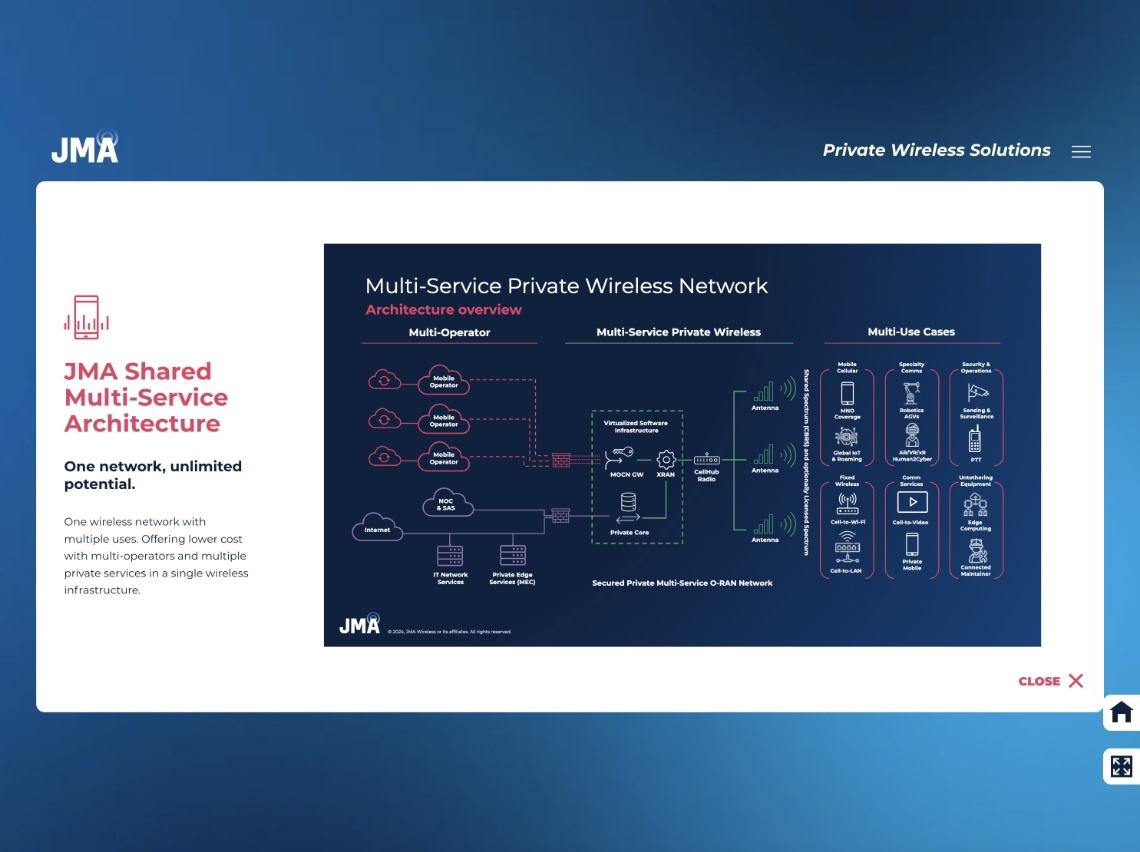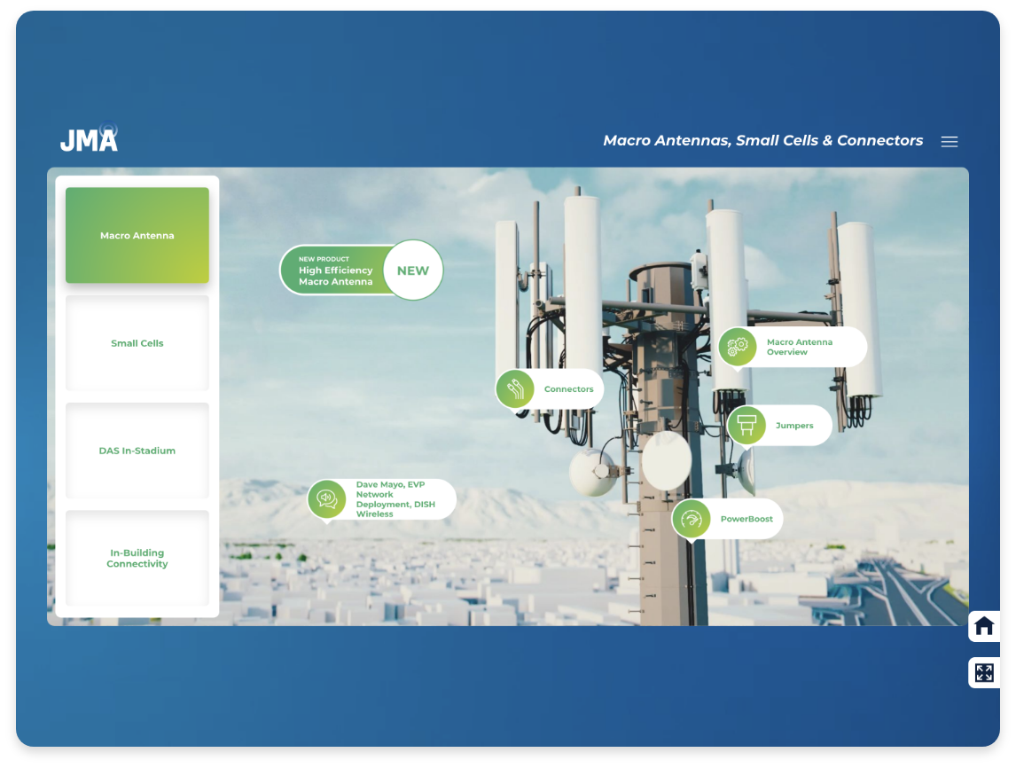 Designed by JPC, ‘JMA Solutions’ a narrative platform aimed at showcasing JMA’s innovative solutions through compelling use cases. The platform serves as an interactive experience, offering firsthand exploration of JMA’s solutions and effectively conveying the company’s expertise and commitment to enhancing internet and mobile coverage. The overarching goal was to highlight JMA’s dedication to innovation and its seamless bridging of technology with real‑world applications.