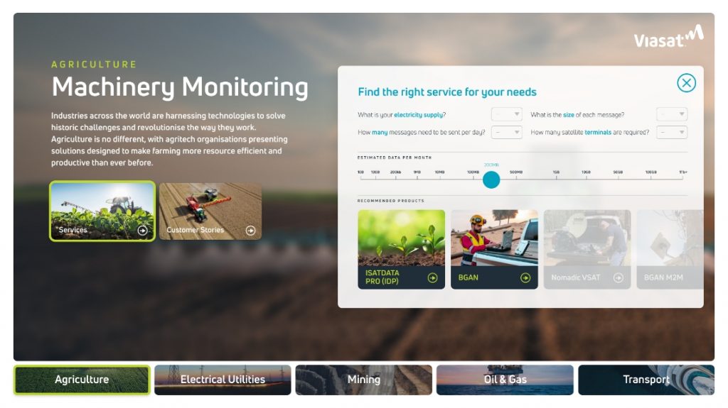 ‘Viasat Interactive Tool’ is an innovative and interactive platform crafted by JPC for Viasat to showcase their solutions through compelling use cases. The app was developed based on the original idea, vision, and design provided by JPC, with our assistance in the development‑process. This multifaceted tool allows users to explore the breadth of Viasat’s services independently. It functions as a dynamic touch screen application ideal for captivating presentations at industry events and expos, and as a seamlessly navigable website accessible from any device with internet connectivity. Within this innovative framework, users encounter engaging content such as immersive case studies and captivating videos, designed to provide a comprehensive understanding of Viasat’s offerings. The platform features an intelligent calculator – solution finder, which, after a few simple questions, matches users with the most suitable‑service.